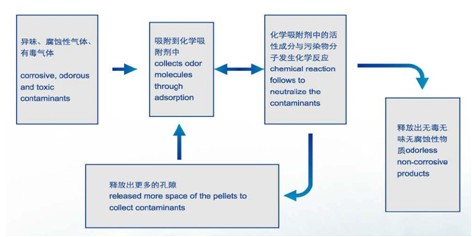 气相净化去除有害气体的过程是不可逆的,反应过程不发热、不燃烧,生成盐类和水;